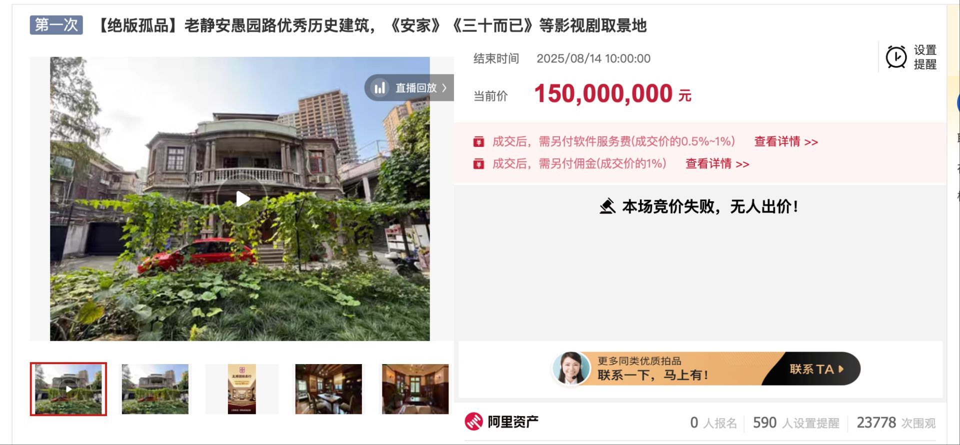 8月14日10时,上海静安区愚园路532弄一处起拍价1.5亿元、单价约43万元/平方米的独立花园别墅在阿里拍卖平台结束挂牌竞价,由于无人出价而流拍。