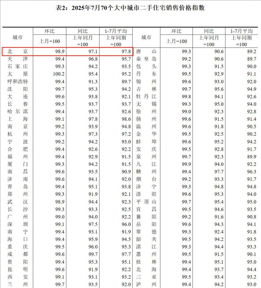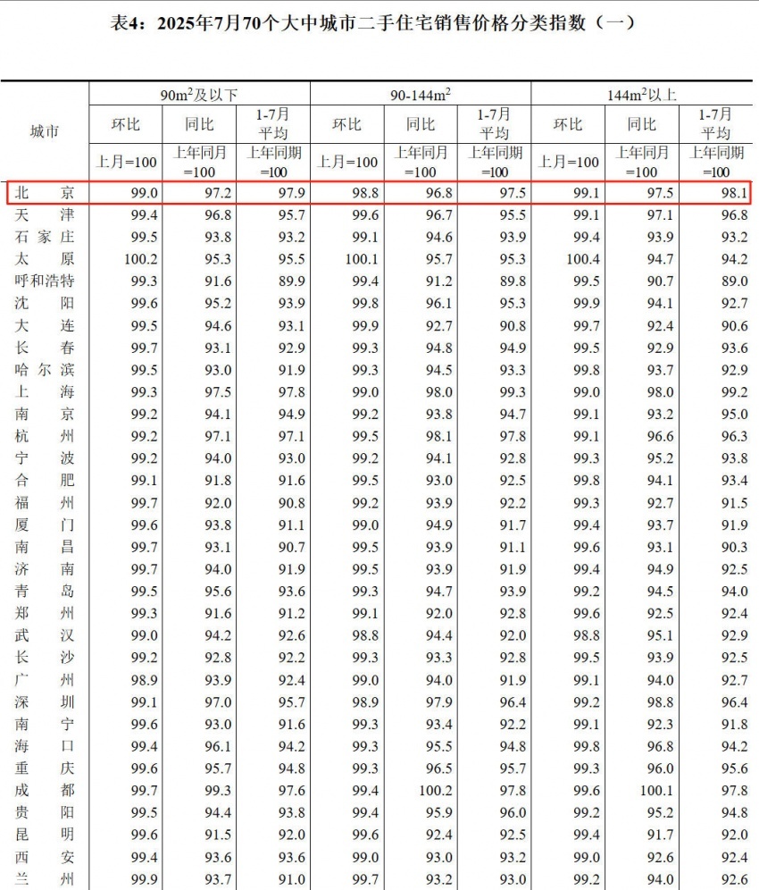 凤凰网房产北京讯 8月15日消息,国家统计局公布《2025年7月份70个大中城市商品住宅销售价格变动情况》。具体来看,7月北京新建商品住宅价格环比持平,同比下降3.6%,同比降幅持续收窄;二手房住宅价格环比下降1.1%,同比下降2.9%,降幅均持续扩大。