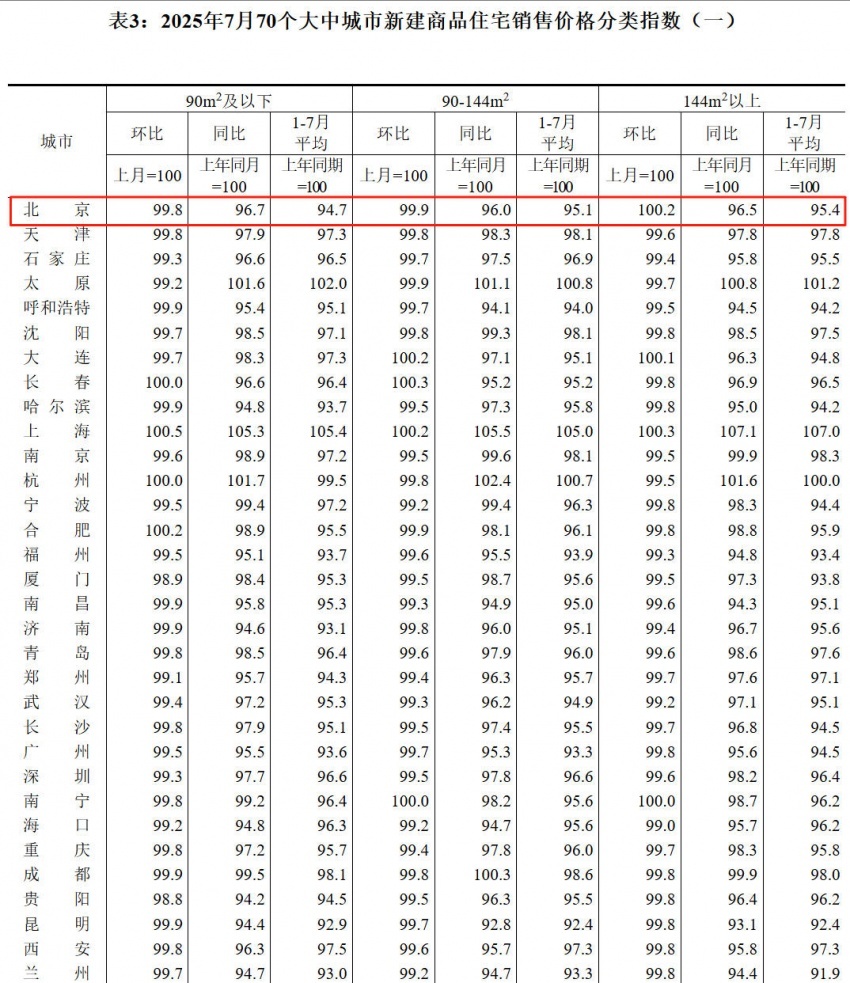 表3:2025年7月70个大中城市新建商品住宅销售价格分类指数