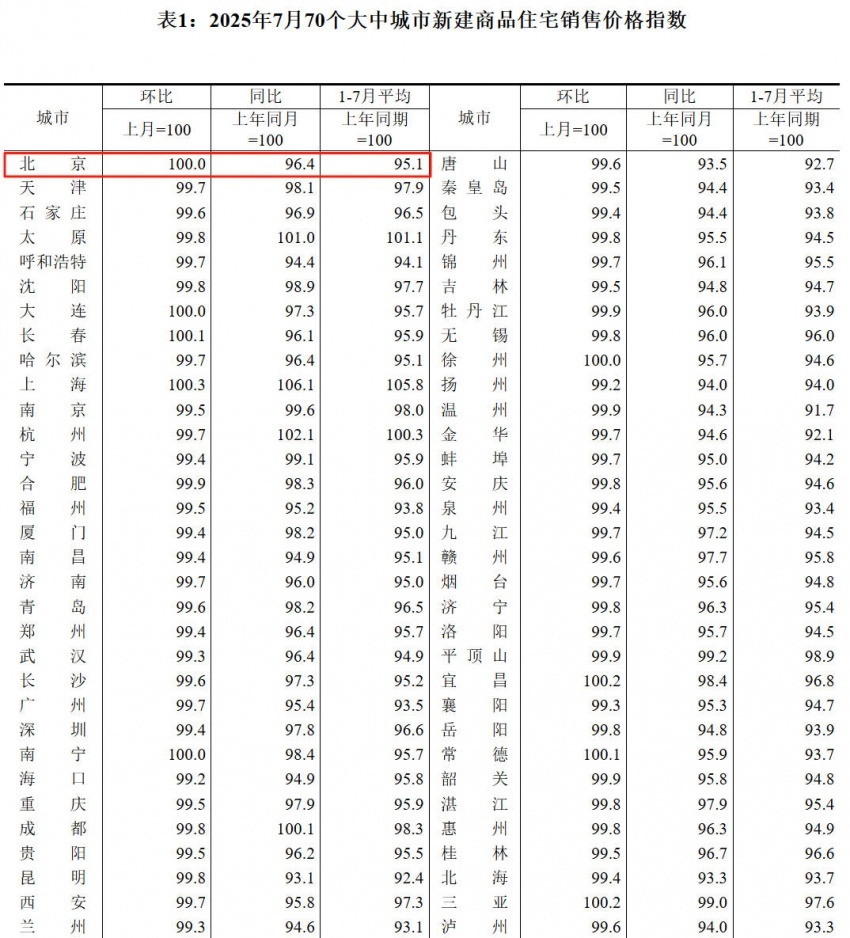 表1:2025年7月70个大中城市新建商品住宅销售价格指数