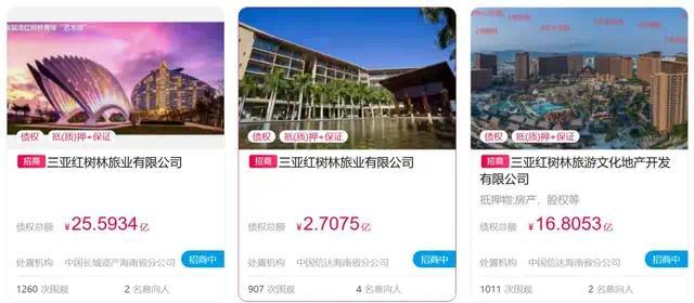 根据阿里资产平台最近披露的信息,本次挂牌的3宗债权分别为中国长城资产海南分公司对三亚红树林旅业有限公司的25.59亿元债权,中国信达海南分公司对三亚红树林旅游文化地产开发有限公司的16.8亿元债权和三亚红树林旅业有限公司2.7亿元债权。