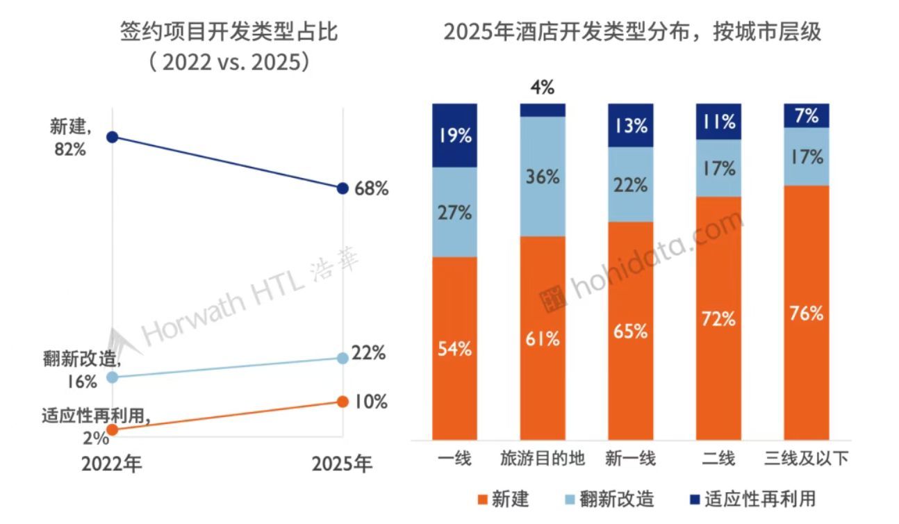 浩华方面3月23日最新发布的数据显示,2025年,在已披露开发类型的酒店签约项目中,新建项目占比由2022年的82%下降至68%。与此同时,存量市场对酒店签约的支撑作用进一步增强,其中翻新改造项目占比提升至22%,适应性再利用项目(即非酒店物业改造为酒店)占比提升至10%。