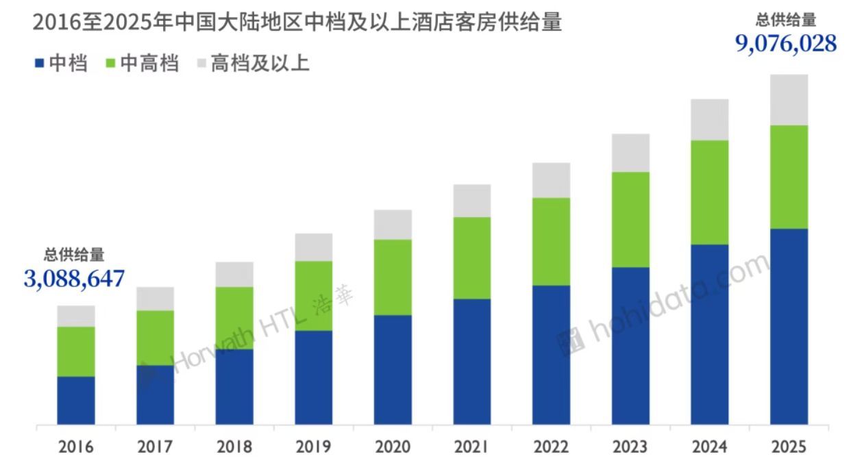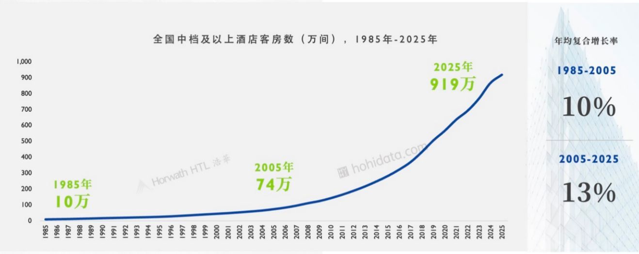 浩华管理顾问公司大中华区总经理、中国旅游饭店业协会副会长戴雪英在接受每经记者采访时指出,中国酒店行业经历了40年发展,完成了供给规模和产品格局的构建。根据厚海数据平台的统计,中国中档及以上酒店市场的供给规模已经突破900万间客房,而1985年的规模仅为10万间。
