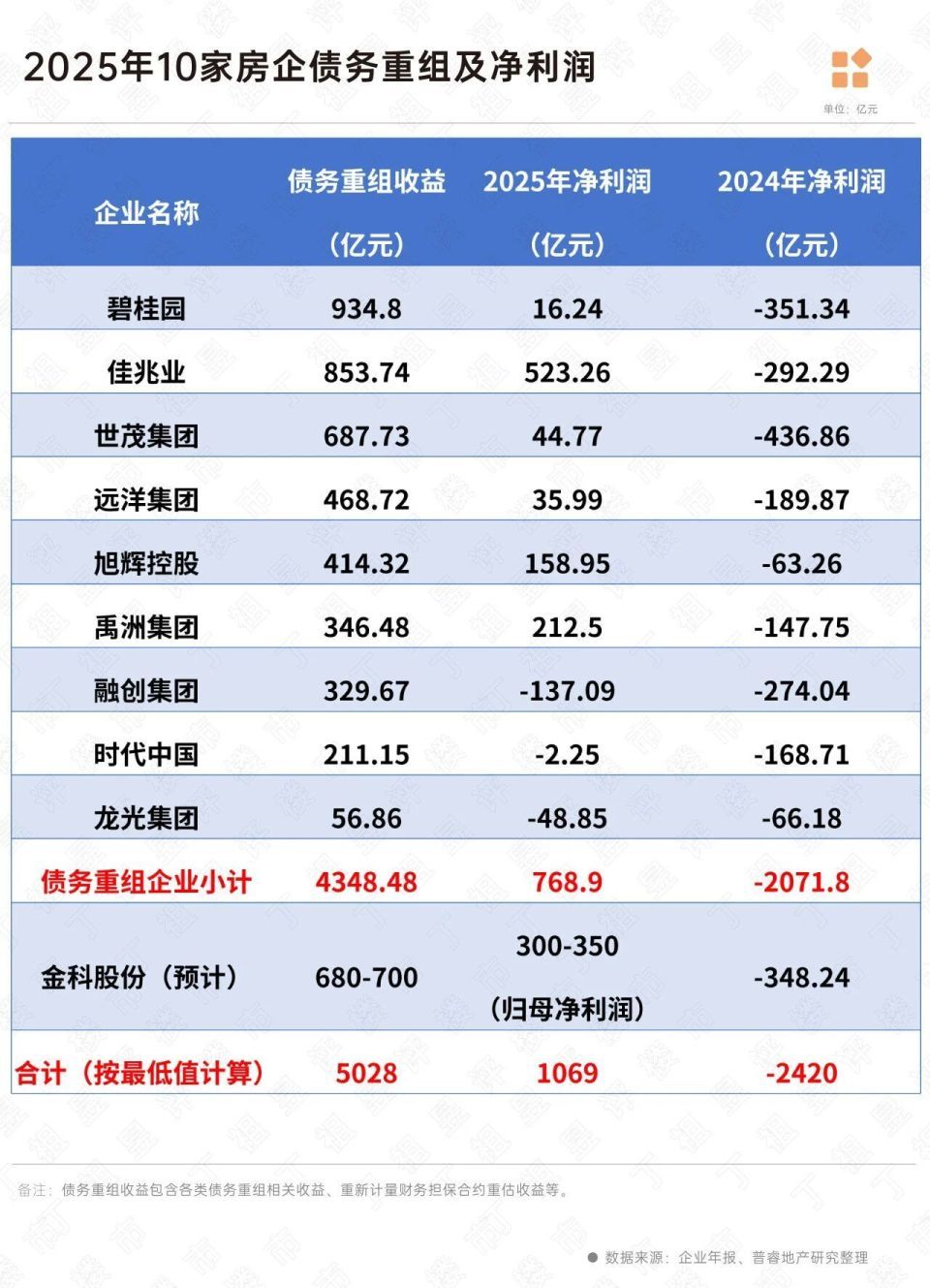 若加上金科,10家房企2025年房企债务重组、企业重整收益合计超过5000亿元。