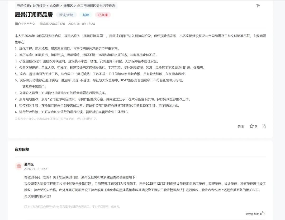 尽管北京市通州区住房和城乡建设委员会在回应中表示,“晟景汀澜的验收合格”,也未能打消购房者疑虑。此后,抖音等平台上先后出现了多个该项目的验房视频,均称其精装修存在质量问题。
