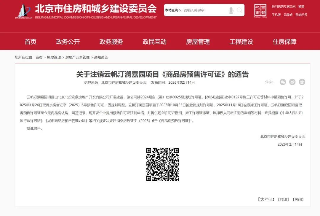 今年2月14日,北京市住房和城乡建设委员会发布通告,注销 “云帆汀澜嘉园” 的项目的《商品房预售许可证》(京房售证字(2025)6号)。直至3月28日,项目才重获预售证,备案名“栖云嘉苑”。